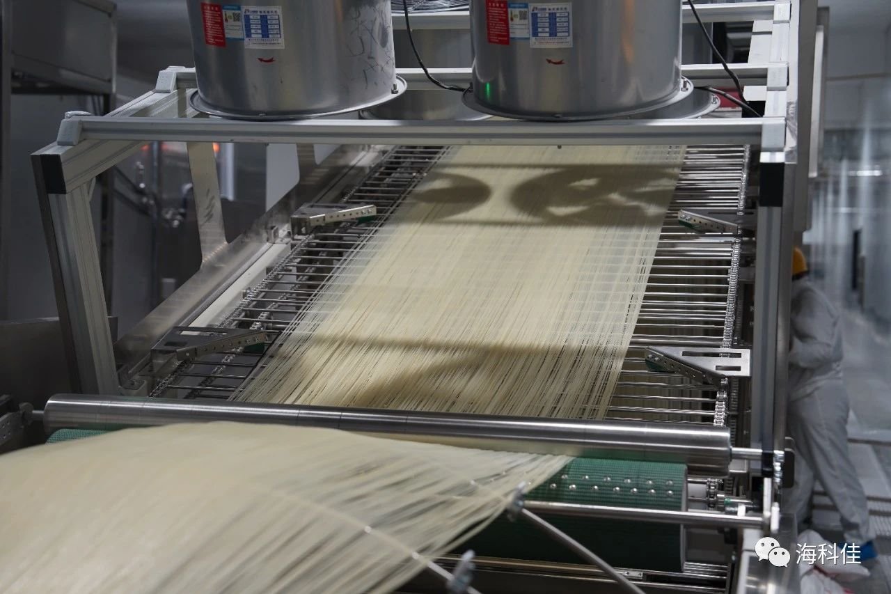由青島海科佳制造的米粉生產(chǎn)線裝備,通過全過程的智能控制系統(tǒng),保證了全過程產(chǎn)品品質(zhì)、效率和效益的優(yōu)化,實現(xiàn)了大產(chǎn)能、規(guī)模化生產(chǎn),完成了從配米制粉、制熟擠絲、老化松絲、自動搓散、節(jié)能干燥、切粉輸送、稱量包裝的全過程自動化生產(chǎn),是國內(nèi)首條全流程直條米粉自動化生產(chǎn)裝備,填補(bǔ)了米粉全產(chǎn)線關(guān)鍵工藝技術(shù)的國內(nèi)外空白,是世界上首條產(chǎn)能最高、用工最少的智能化米粉生產(chǎn)線。