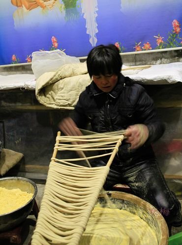 手延面經6次醒發,面筋網絡充分形成,面條經過多次旋轉,形成堅韌的面筋結構,制成面條更有韌勁。面條經多次拉伸,使淀粉均勻附著在面筋網絡的空隙中,使面條更加軟彈、爽滑。